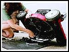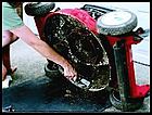 | This Old House Magazine: Putting Your Lawn Mower to Bed An end-of-season tune-up keeps power lawn equipment in shape By Scott Schilling, Photos by Kenneth Chen From This Old House Magazine Gas-powered lawn mowers and trimmers take their share of abuse during the warm months, so some care at the end of the season is vital to keeping their parts in good working condition. Replacing the oil, spark plugs, and air filters and applying a bit of elbow grease to grimy recesses before storing mowers for the winter will ensure that they rev up with a pull of the cord next year. Figure A Audrey Meinking, owner of Mineola Bicycle, Fitness, and Mower in Mineola, New York, demonstrates the proper servicing on a push mower; the same process also works for other small gas-powered machines such as trimmers and snowblowers. "If you don't take an hour or two for maintenance or bring your machines to a pro for servicing," she says, "there's a big chance you'll be stuck watching the grass grow come spring." 1. Empty the Gas Tank (figure A) Unused gas left in a mower over the winter can get stale, gumming up the carburetor and inviting rust. First, add fuel stabilizer to the tank, then run the mower to distribute it through the system. Turn the mower off and allow the engine to cool, then siphon excess gas into a clean can. (You can put this gas in your car, provided it hasn't been mixed with oil.) Restart the mower and run it until it stops; repeat until the engine no longer starts and the fuel lines are empty. Figure B 2. Disconnect the Spark Plug (figure B) Before continuing with the remaining maintenance steps, it's very important that you disconnect the spark plug to prevent the mower from kick-starting accidentally, which could lead to serious injury. Figure C 3. Remove the Blade (figure C) To make it easier to change the oil and clean the underside of the mower, first detach the blade by unscrewing the bolts that hold it in place. Be sure to wear thick gloves when handling the blade. While the blade is off, take advantage of the opportunity to sharpen it Figure D 4. Drain the Oil (figure D) If the mower has a 4-cycle engine, you'll need to change the oil. (Some mowers and most trimmers have 2-cycle engines, in which the oil is mixed with the gas.) Have a pan ready, and place a tarp under the mower to catch any oil that might spatter. Set the mower on its side with the air filter and carburetor facing up, so oil and residual gas don't spill into them. Remove the oil reservoir plug and slowly tilt the mower until the oil begins to drain into the pan. Replace the plug when all the oil has drained. Figure E 5. Clean the Undercarriage (figure E) Use a putty knife and wire brush to scrape off the grass and mud caked on the mower deck. This prevents rust, clears the passageway to the discharge chute, and allows the aerodynamics of the deck to work as designed. With the deck cleaned, reattach the sharpened blade. Once you've finished and can turn the mower upright, fill the oil tank with fresh SAE 30 or 30-weight oil, and recycle the used oil at a service station. Don't use a thicker oil, such as 10W-40. Figure F 6. Change the Air Filter (figure F) A dirty air filter keeps the engine from burning gas efficiently by restricting the air needed for combustion. If your mower has a paper filter, replace it with a new one, paper edges facing out. If it's an oil-soaked sponge filter, remove it, wash it out with soap and water, allow it to dry completely, and then add a bit of clean oil to it before putting it back. Clear the cooling fins of dirt and debris using a screwdriver or Popsicle stick. Figure G 7. Replace the Spark Plug (figure G) Remove and replace the spark plug, using a socket wrench with a spark-plug socket, which has a neoprene lining to protect the plug's porcelain casing. Even if the old spark plug is in good shape, for a couple of dollars a new one will perform better and ensure a smooth start come spring. ______________________________ The Cutting Edge A mower blade that has developed nicks, dings, and curls from hitting rocks and branches is no good to your lawn. A dull blade rips grass instead of cutting it cleanly, which leaves it more susceptible to disease. To sharpen a blade that's in fairly good condition, just clamp it in a vise every couple of weeks and run a metal file along the cutting edge, making sure to follow the angle of the factory bevel. (Always disconnect the spark-plug wire before taking off the blade or doing any mower maintenance.) If the blade is badly damaged, it needs to be sharpened on a bench grinder or may need to be replaced. A service shop can sharpen it for you or tell you when it's ready for the trash bin. But if you have your own grinder, it's easy to do the sharpening yourself. Begin by running the blade back and forth perpendicular to the spinning wheel to grind out nicks. This will give you a blunt but straight edge. Then hold the blade—supported by the rest plate—at the angle of the existing bevel and grind the length of the blade until you get a sharp edge. Finally, check to make sure the blade is balanced: An off-kilter blade can damage the mower. It's easy with a plastic balancer, available at lawn equipment shops and home centers for just a few dollars. Rest the blade on the balancer; if one side dips down, then you need to grind a bit of steel from that end (not from the cutting edge) to lighten it. Once the blade is balanced, bolt it back on the mower and you'll be ready to attack the long grass. |