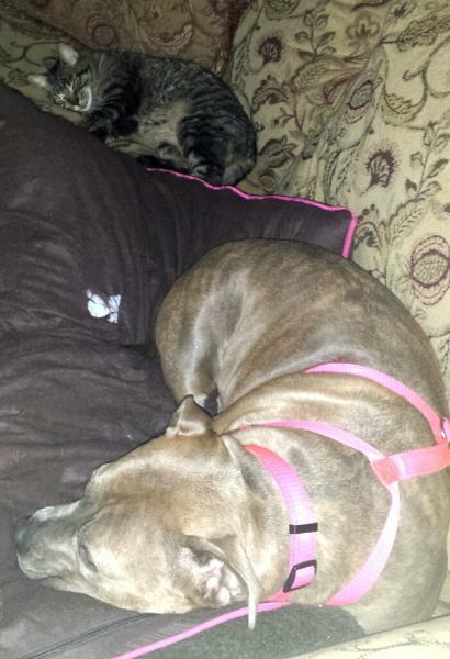 | It took about 6 months, but it turns out Bella likes the Feral Momma Cat who has decided to come inside to live. Zika 12/2018 |
