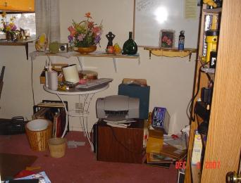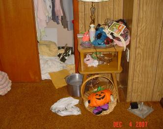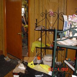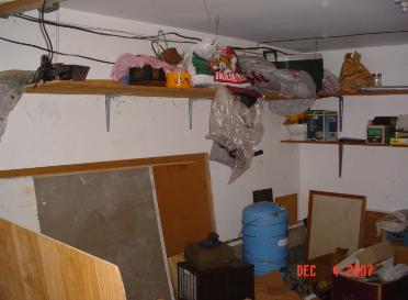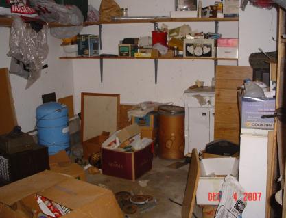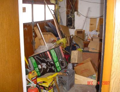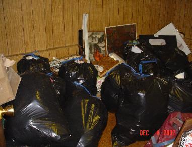 | I cleaned out the area where the washer and dryer were and this is where I have put about half the bags we packed up. We are running out of room to put them. We have packed up 35 garbage bags of old papers, planters, clothes that are stained, broken dishes, old plastic dish pans, numerous hospital dishpans, old wrappers, newspapers, still more phone books, tons of old shoes, boots, old stained coats, cat stuff, years worth of empty laundry containers, old stained linens, broken nicnacs, old broken lamps, boxes and boxes of canned goods probably from down south years ago, and just so much more stuff it is too numerous to mention. Every corner of his house was stuffed with things. Even his Sump Pump was stuff with old bottles, paint cans, chemicals, etc. |