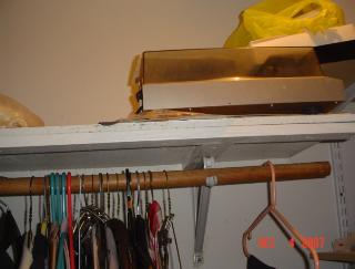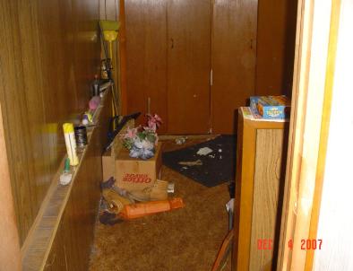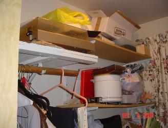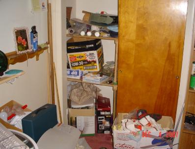 | Hallway closet by fridge. We found all the boys trophies stuffed way in the back underneath all this stuff. We also found a leaf to the kitchen table. |