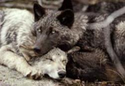 | Wichita, Kansas, 1997 Photograph by Joel Sartore A Mexican gray wolf snuggles with two pups at the Sedgwick County Zoo. At one time, gray wolves were among the most widely distributed mammals on Earth. However, by the early 1900s, unchecked trapping, poisoning, and hunting of these highly intelligent predators drove the species to the brink of extinction. (Text adapted from and photograph shot on assignment for, but not published in, "Return of the Gray Wolf," May 1998, National Geographic magazine) |