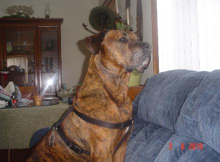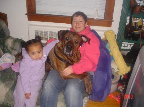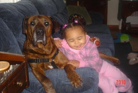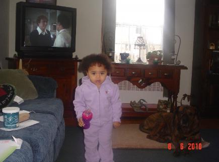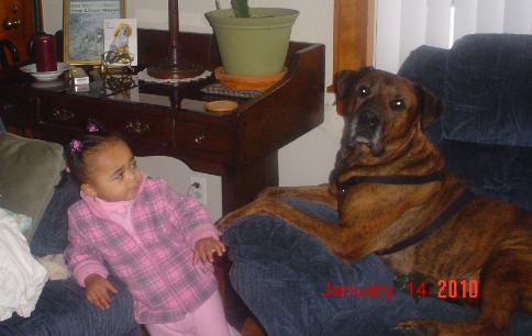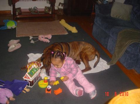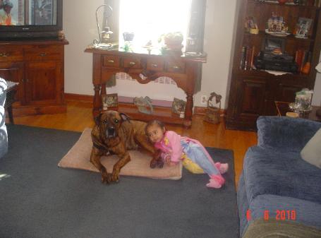 | Bully never ceases to amaze me. For as large a dog as he is, his heart is even larger. This is our Granddaughter Zeriah who is just 2 years old. Bully has taken an instant love to her and she to him. When she comes into the room his tail starts wagging and his body wiggles with great delight. She is so happy to see him and squeals with happiness. As she moves towards him, he becomes very still and quiet, and extremely gentle. When we have her with us, he lets us know he wants to be near her. Please scroll down to see these two enjoying each other 1/2010 |
